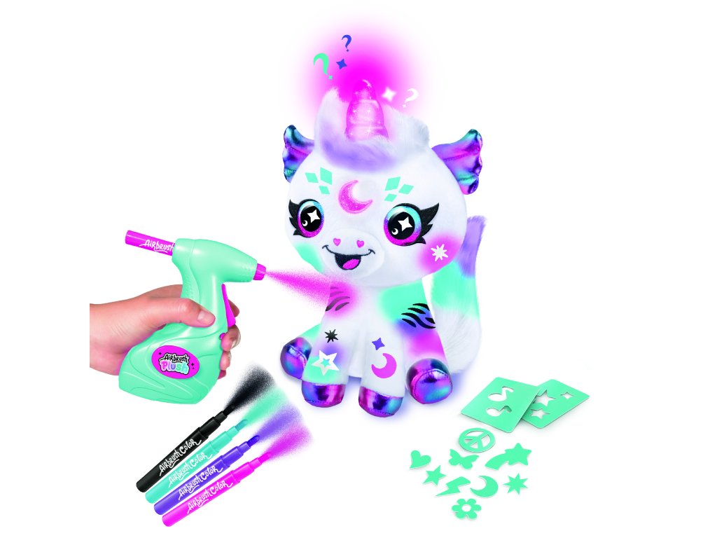 Navrhni a vybarvi si svého vesmírného jednorožce. Součástí tohoto balení je plyšové zvířátko, airbrush nástroj, 4 různé barevné náplně, 100 různých šablon a návod. Plyšové zvířátko si můžeš pomocí airbrushe libovolně posprejovat, můžeš využít různé barvy a šablony. Fantazii se meze nekladou. Pokud se ti vytvořený design přestane líbit, stačí plyšáka omýt vodou a můžeš začít znovu. Plyšákovi svítí kouzelný roh a může odpovědět na otázku ano-ne (jazyk hračky je angličtina). Výrobek je vhodný pro