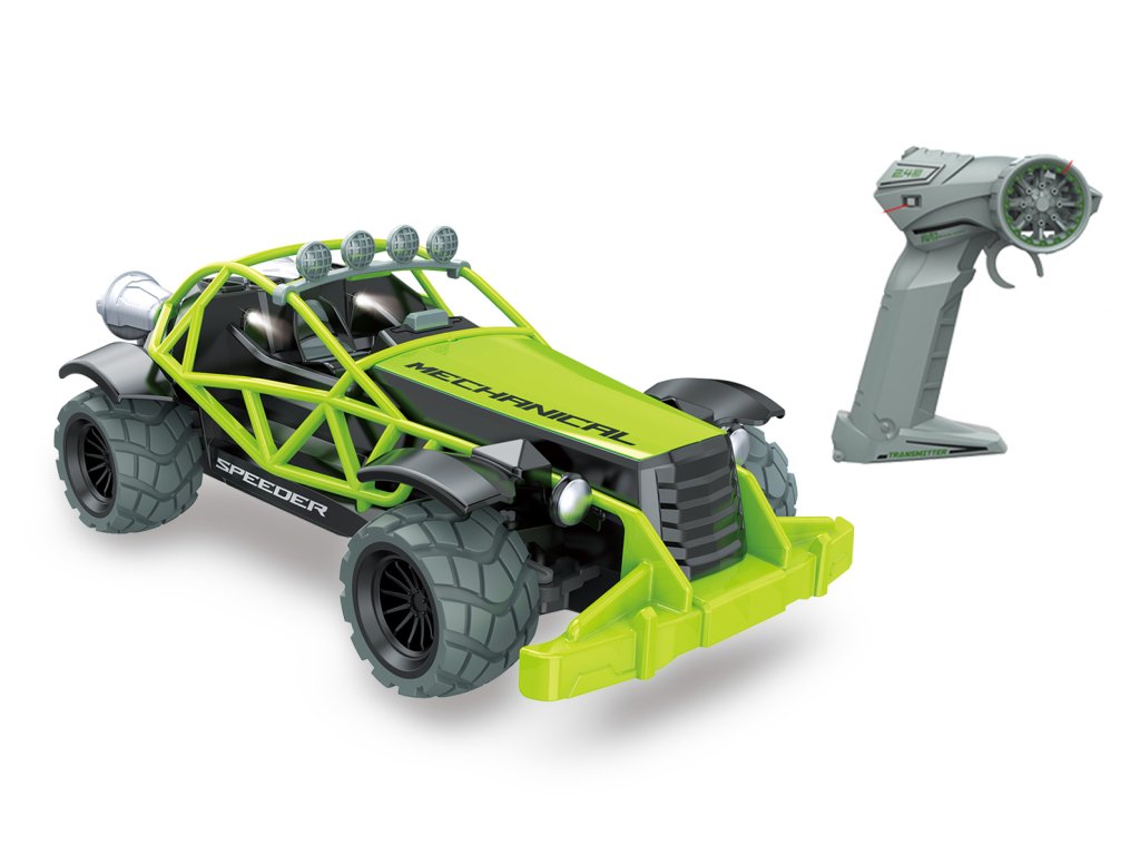 Bugina Speeder RC na dálkové ovládání. Velikost 22 cm. Frekvence 2.4GHz. Pistolový ovladač. Světelné efekty. 4xAA baterie do auta, 2xAA do ovladače nejsou součástí. Přepínač ON/OFF na spodní straně buginy a na ovladači.Doplňkové parametry