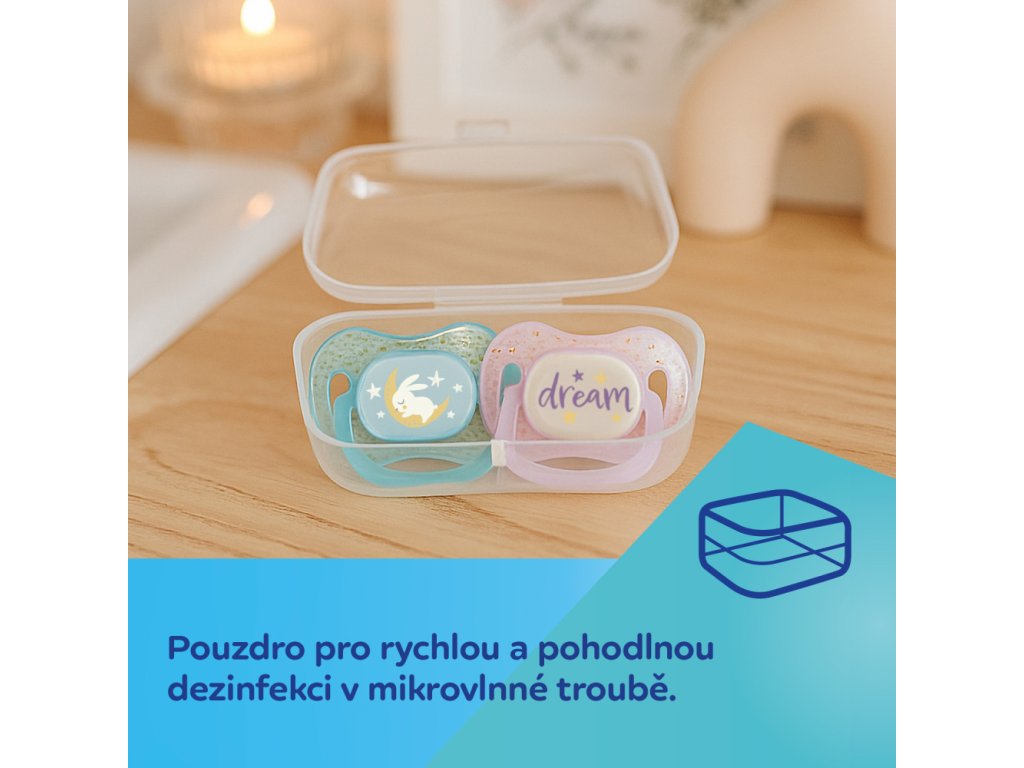 Dudlík je bezpečný a snadno se udržuje v čistotě – balen v moderním sterilizačním pouzdru, které lze využít k uskladnění, ale i k rychlé a pohodlné sterilizaci v mikrovlnné troubě.