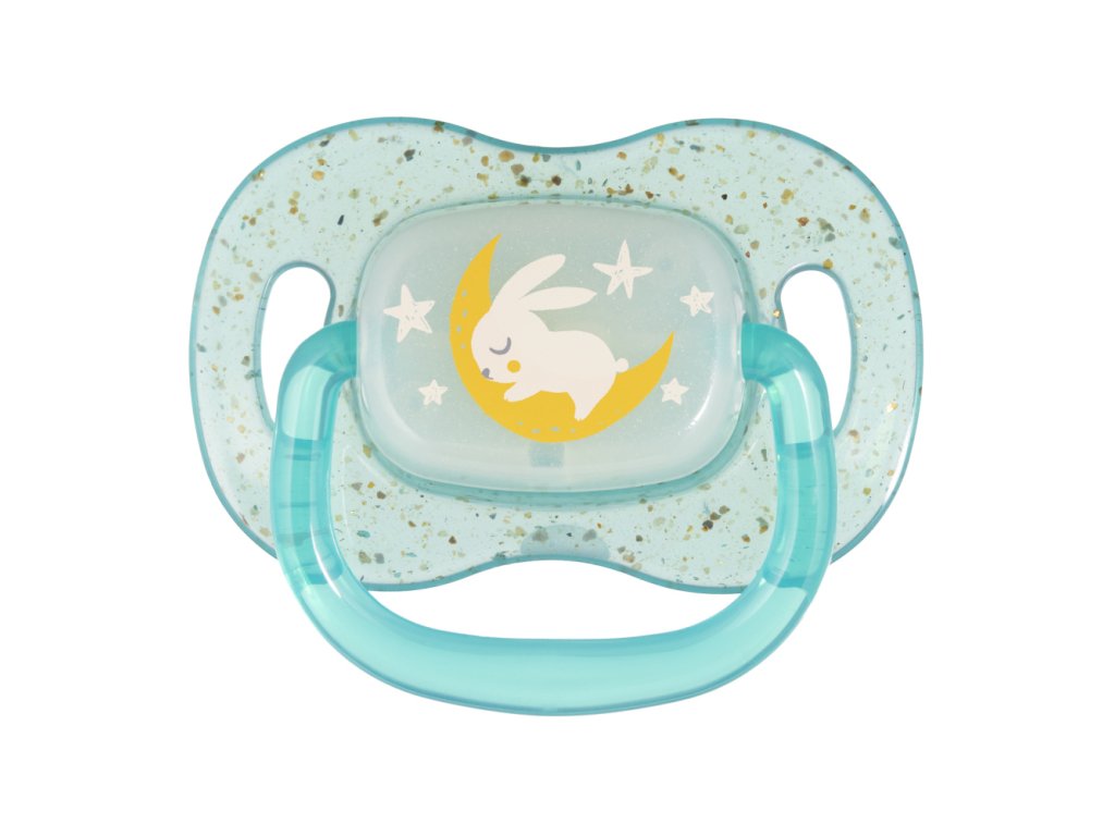 Canpol babies svítící dudlík z kolekce NIGHTGLOW má ve tmě svítící střed, což usnadňuje jeho hledání v noci, aniž by došlo k probuzení miminka – navrženo pro klidný spánek a každodenní pohodlí.