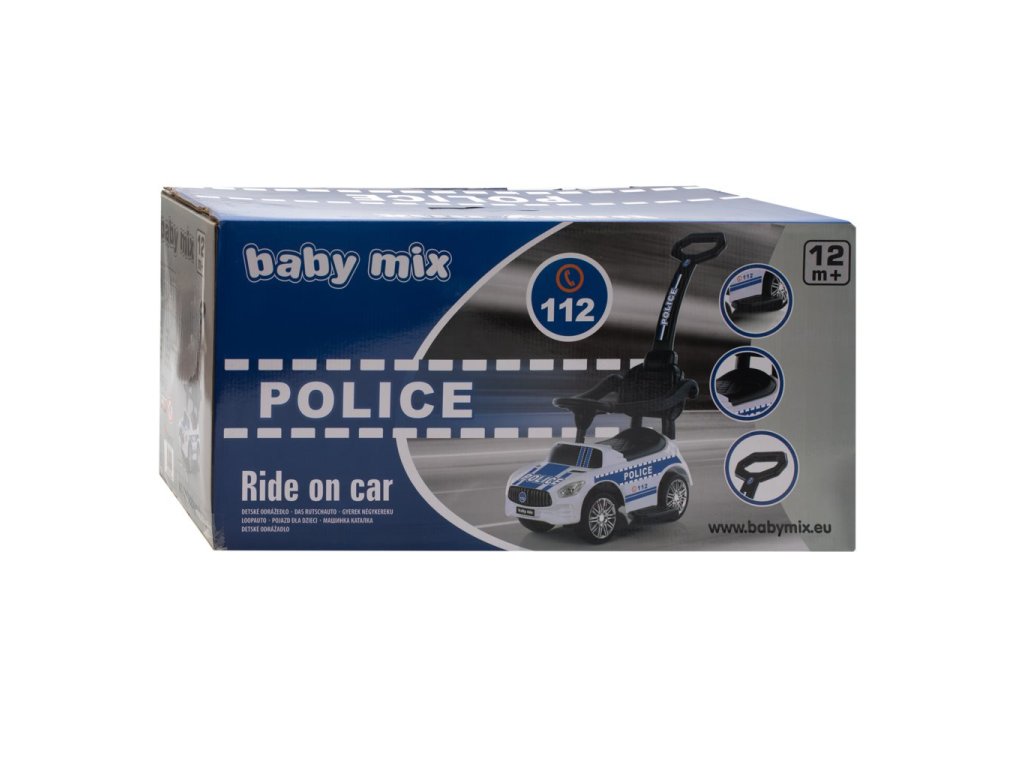 Policejní autíčko jezdítko Baby Mix je opravdovou lahůdkou pro všechny malé strážce zákona. Dokonalé zpracování a detaily jako kola, světla nebo tvar karoserie, přitahují pozornost všech a rychle se stanou oblíbenou hračkou doma i na procházce. Je vyrobeno z kvalitních materiálů a je vybaveno zvukovým panelem. Jezdítko pomáhá rozvíjet motorické schopnosti dítěte a zaručuje spoustu zábavy a radosti. Díky speciální blokádě v zadní části je váš závodník chráněn proti převrácení. Vodící tyč, opěrky na ruce a podnožky lze sundat, a tím dítě využije autíčko jako klasické odrážedlo.