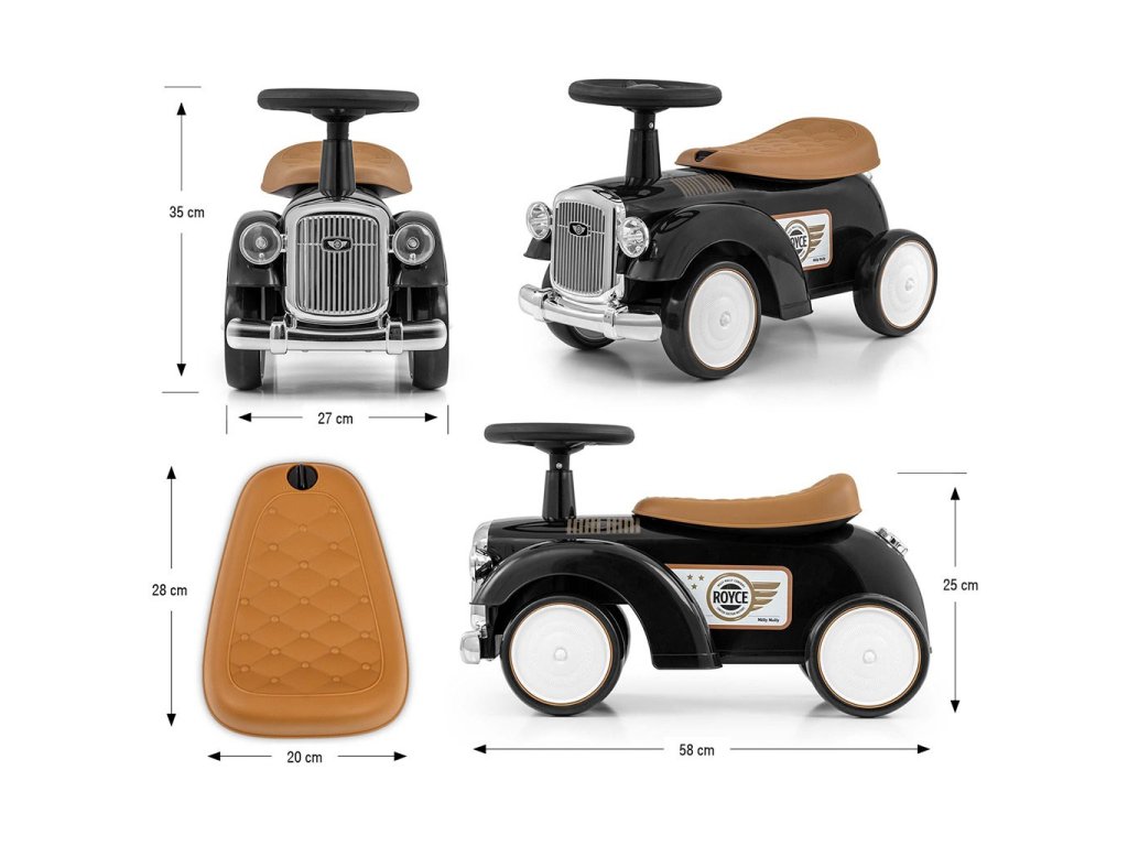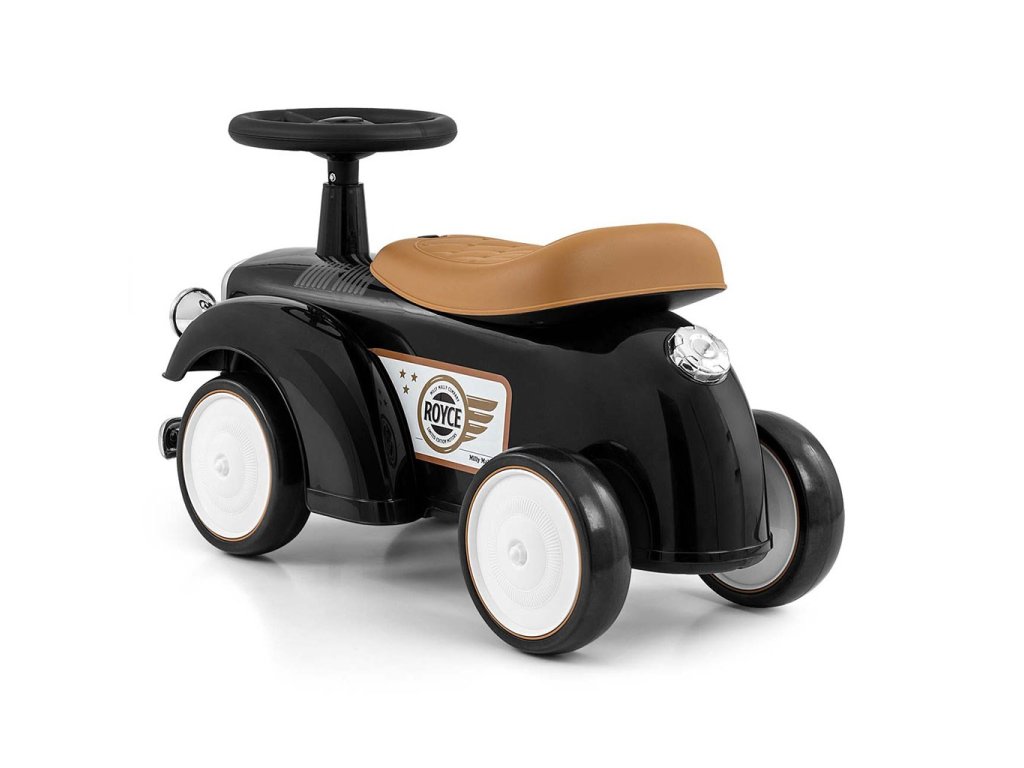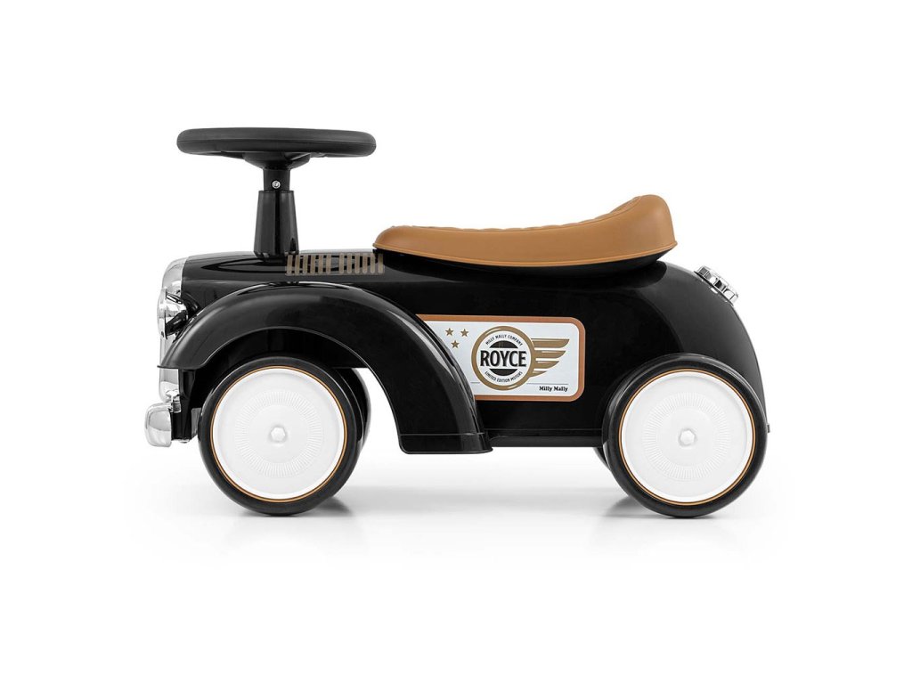 Vintige odrážedlo Royce od Milly Mally zve malé cestovatele na retro jízdu. Upoutá svými oku lahodícími barvami. Je bohatě vybaveno. Toto autíčko má volant se zvukem a tvarované sedadlo. Poskytne vašemu dítěti skvělou zábavu při řízení a rozvíjí jeho smysl pro rovnováhu a všeobecné motorické dovednosti. Autíčko má lehkou plastovou konstrukci a ergonomické tvary. Otočný volant našeho jezdce Royce umožňuje náročné manévry doma i na procházkách. Kola tohoto krásného vozidla jsou vyrobena z měkké pěny EVA. Retro autíčko může vaše dítě používat jako své první vozidlo s opravdovým volantem a klaksonem, dále jako kočárek s otevřeným úložným prostorem na hračky (malý kufr), imitací palivové nádrže na zadní části vozidla a přední částí auta - mřížkou ve stříbrné barvě. Logo ROYCE dodává tomuto vozidlu na estetice a prestiži. Závěrečnou tečkou za vozítkem Royce je jeho dárková krabička, která je zachována v charakteru retro vozidel z počátků automobilového průmyslu. Vozítko Royce je určeno všem dětem, které umí samostatně sedět. Vozítko lze používat v interiéru i exteriéru a zpříjemní vašemu dítěti čas strávený na procházce.