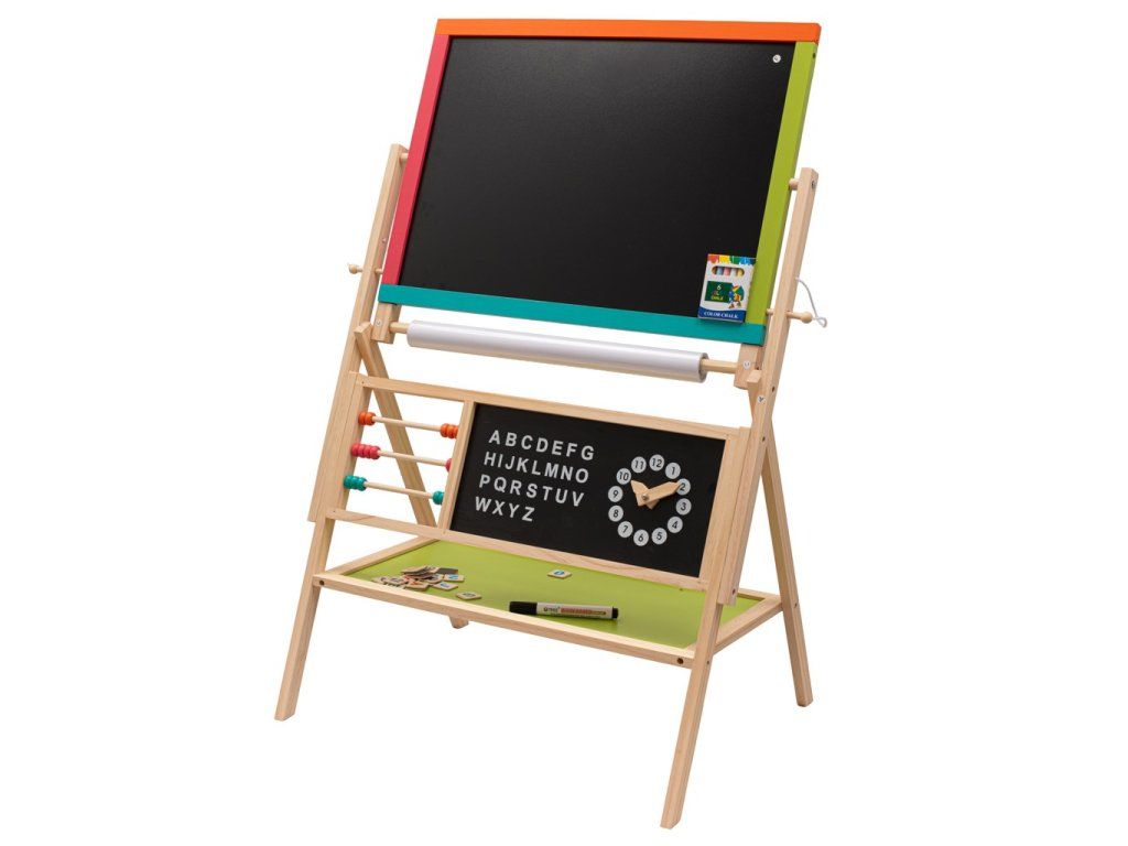 - oboustrannou psací plochu – bílou magnetickou stranu na fix a klasickou černou pro kreslení křídou,