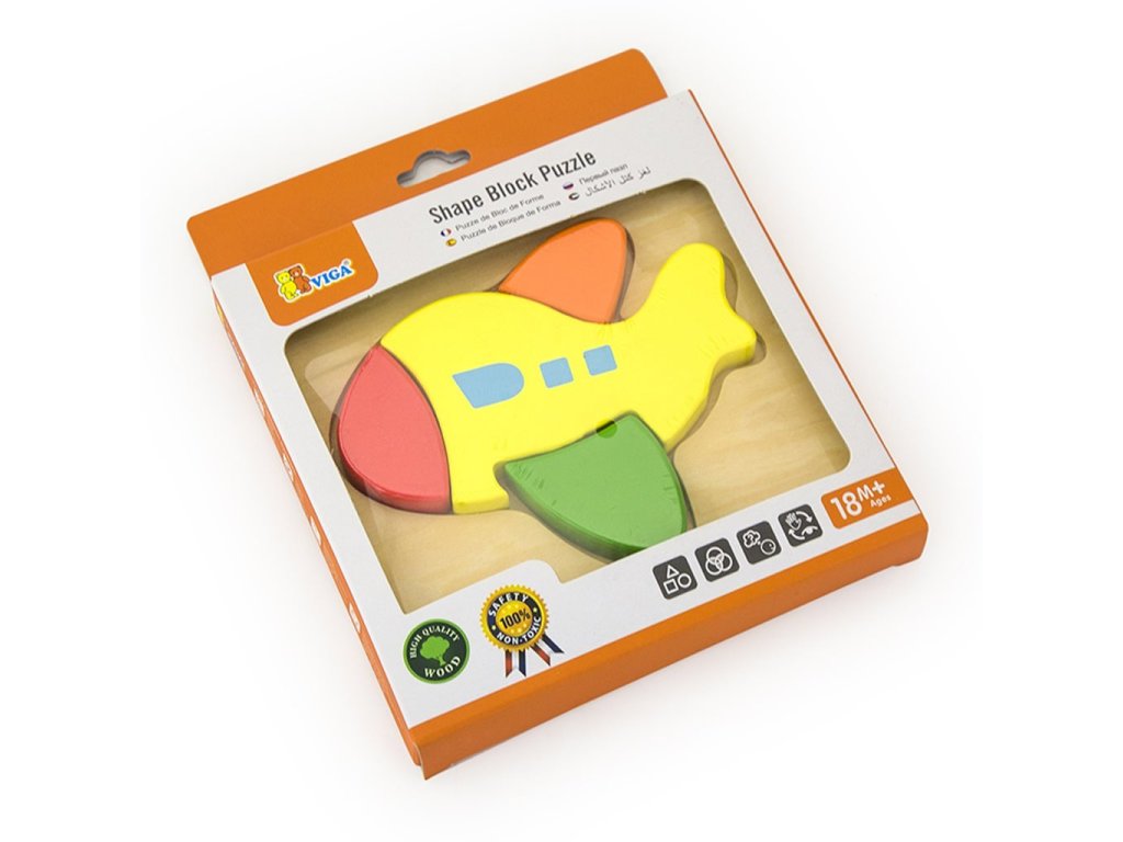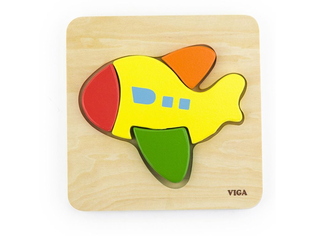 Kvalitní dřevěné puzzle pro nejmenší Viga Letadlo. Puzzle na dřevěném podkladu je tvořeno čtyřmi dílky. Velké oblé dílky zajišťují snadnou manipulaci a přiložená deska s vyfrézovaným obrysem usnadňuje skládání a správné zapadnutí dílků. Balení obsahuje 4 dílky. Určeno pro děti od 18 měsíců. První puzzle pro Vaše malé děti, má velmi výrazné barvy, jednoduchý design a velké dílky. Naší prioritou je bezpečnost a kvalita našich výrobků, a proto barvy použité na hračkách nejsou toxické a splňují bezpečnostní standardy (EN71 a ASTM). Hračka je vhodná i jako krásný dárek pro naše nejmenší. Rozměr cca: 145 x 145 x 18 mmDoplňkové parametry
