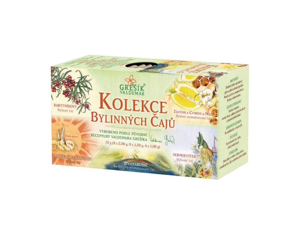 Kolekce obsahuje 5 druhů bylinných čajů: Rakytníkový, Zázvor & Citrón & Med, Zahřívací se zázvorem, Životabudič a Sedmikvítek Hmotnost: 32g (8x2g, 8x1,5g, 4x1g) Výrobce: VALDEMAR GREŠÍK - NATURA s.r.o., Saská 134/60, 405 02 Děčín X - Bělá
