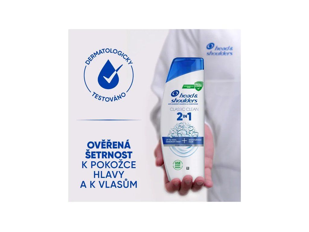 Šampon proti lupům Head&Shoulders 2v1 Classic důkladně očistí pokožku hlavy i vlasy bez toho, aby je vysušil. Pečuje o mikrobiom vlasové pokožky. Udržuje ji v rovnováze, zklidněnou a hydratovanou. Uvolňuje ochranné složky, které předchází tvorbě nežádoucích šupinek a zároveň dodávají komfort v případě podráždění. Kadeře jsou po použití lesklé a hebké na dotek. Šampon navíc zajistí dlouhotrvající pocit svěžesti a čistoty. Je vhodný pro všechny typy vlasů. Má vyvážené pH.