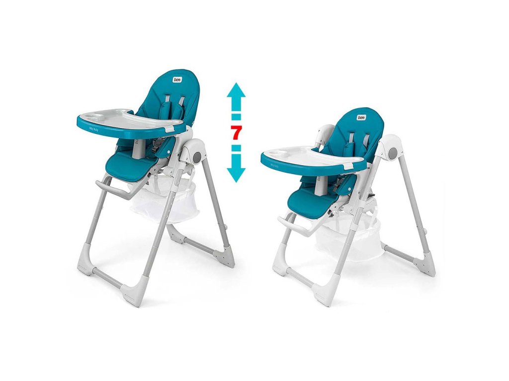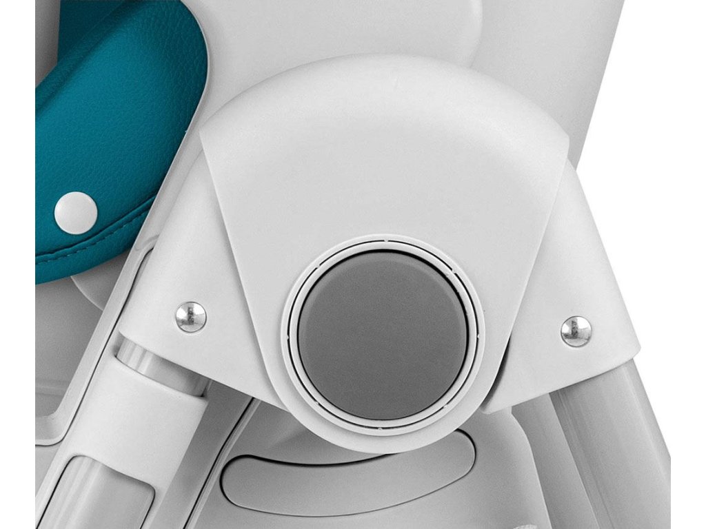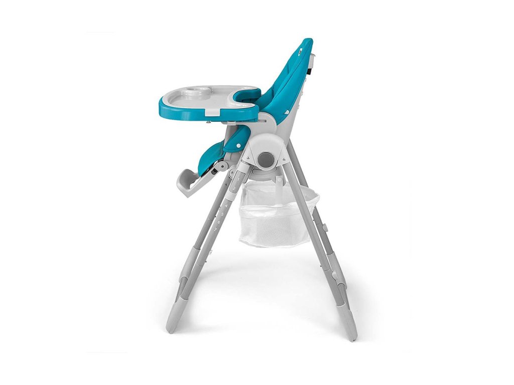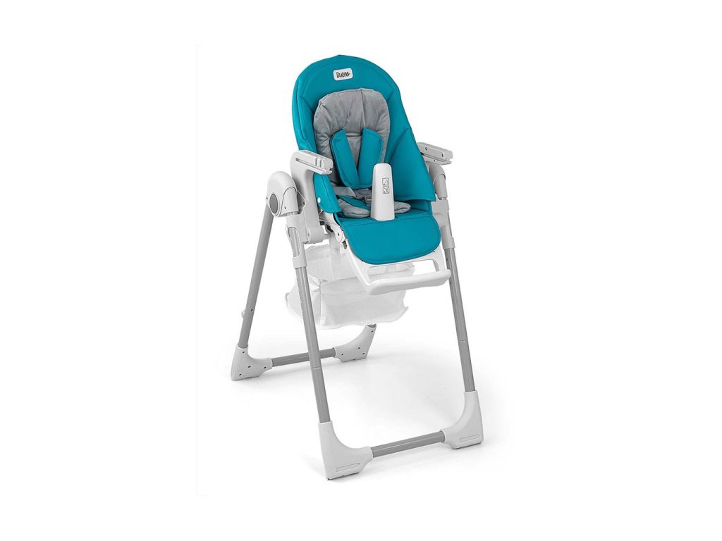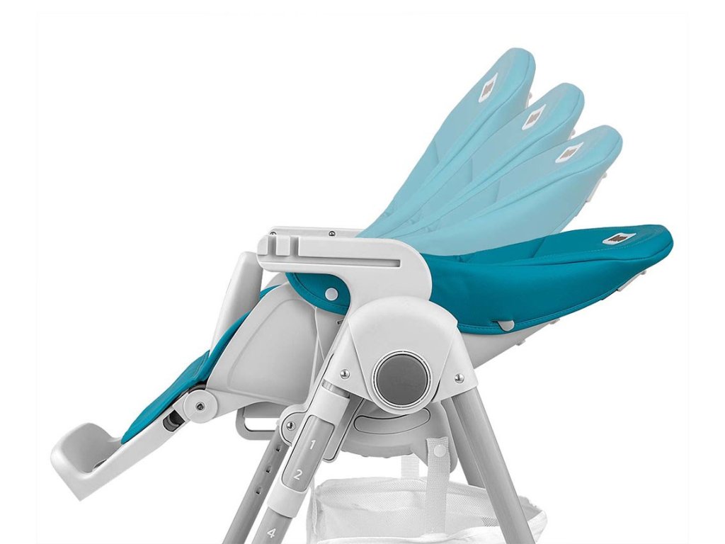 Čalounění židle je vyrobeno z ekologické kůže a má navíc měkkou vložku pro nejmenší. Pro bezpečnost dítěte je vybavena 5-ti bodovými nastavitelnými pásy a přídavnou zábranou proti uklouznutí. Na zadní straně opěradla je úchyt pro zavěšení tácu. Opěradlo i podnožku lze sklopit do lehu. Sedák lze zvednout nebo snížit v 7 stupních a nohy mají zabudovaná gumová kolečka. Celou konstrukci lze snadno a hladce složit.