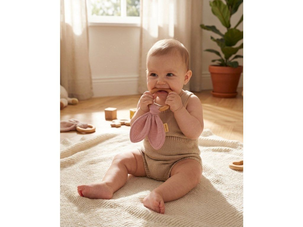 Kousátko s mušelínovou plenou je ideální sada, když se dítěti prořezávají zoubky. Kousátko je vyrobeno z bukového dřeva šetrného ke středu a měkké mušelínové látky. Zcela bezpečné pro děti přináší uklidňující úlevu při prořezávání zoubků. Kousátko lze použít také jako hračku pro miminka. Kousátko se dokonale hodí k našim dalším mušelínovým výrobkům a vytváří tak krásnou sadu, kterou lze darovat na dětskou oslavu.