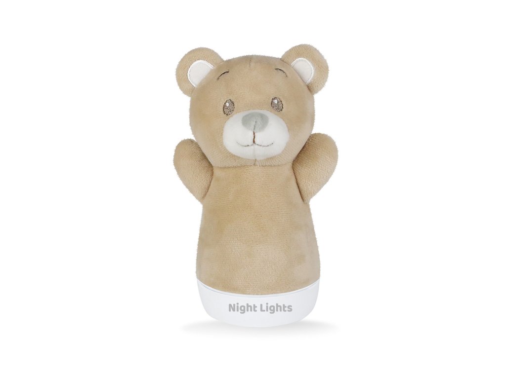 Lampička noční medvídek usínáček plyšový. Rozměry 11x8x15,5 cm. Aktivace přepínačem na spodní straně lampičky. Automaticky se měnící barevné světýlko (7 barev). 3xAAA baterie, nejsou součástí.Doplňkové parametry