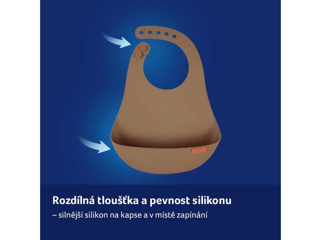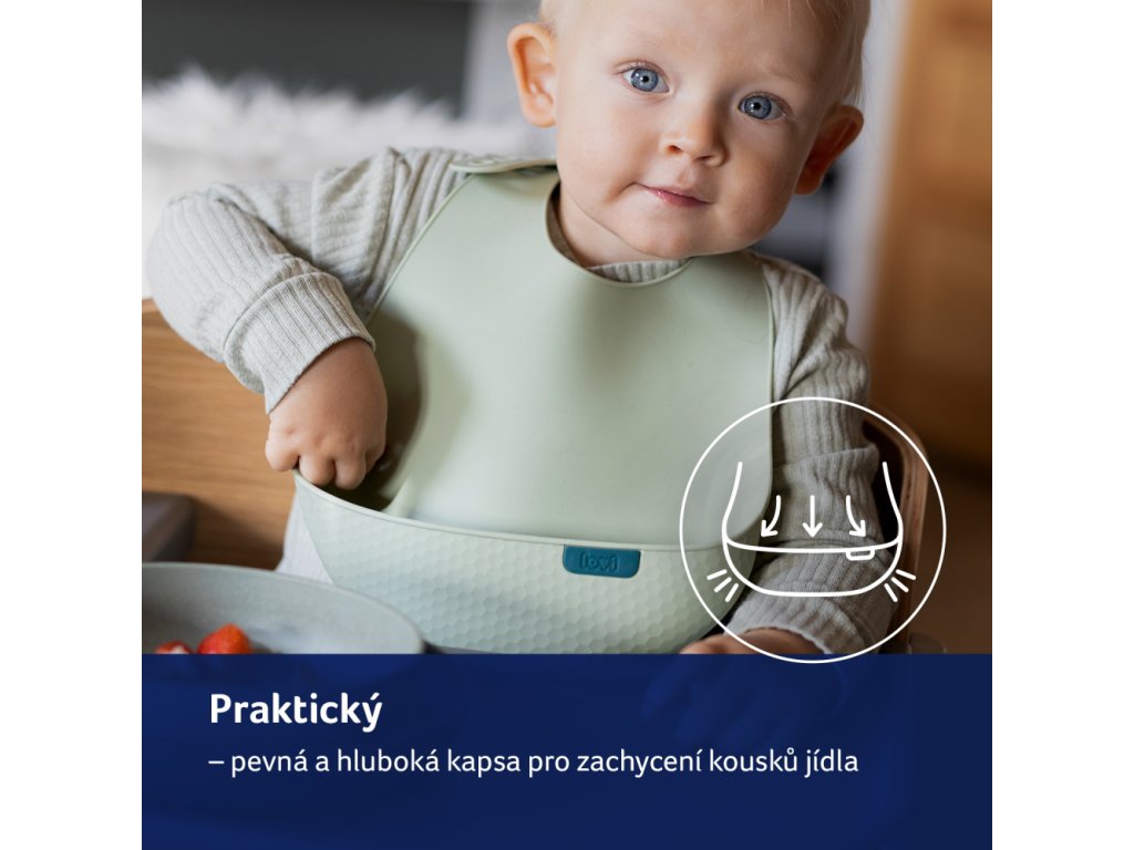 LOVI Silikonový bryndáček s kapsou je velkým pomocníkem pro rodiče - chrání před nečistotami v době, kdy se dítě učí samostatně jíst. Je vyroben z lehkého, měkkého a bezpečného silikonu. Pevná a hluboká kapsa zachycuje zbytky jídla, pohodlně obepíná bříško a zasahuje doširoka do boků miminka. Nastavitelná spona a ergonomický tvar bryndáku, zejména jeho tvarované strany, zajišťují volnost pohybu. Bryndáček má originální design díky unikátní struktuře kapsy a také se snadno čistí a je vhodný do myčky.