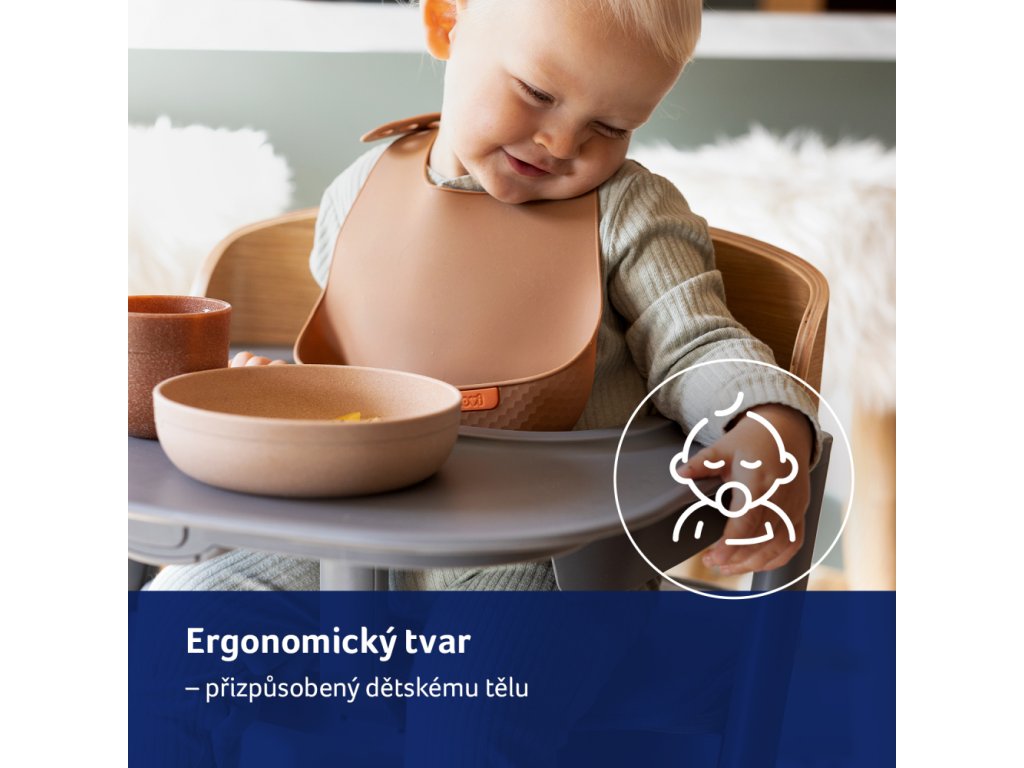 Tvrdá a hluboká kapsa na zachycování zbytků jídla, kapsa obepíná bříško a zasahuje doširoka po stranách dítěte.
