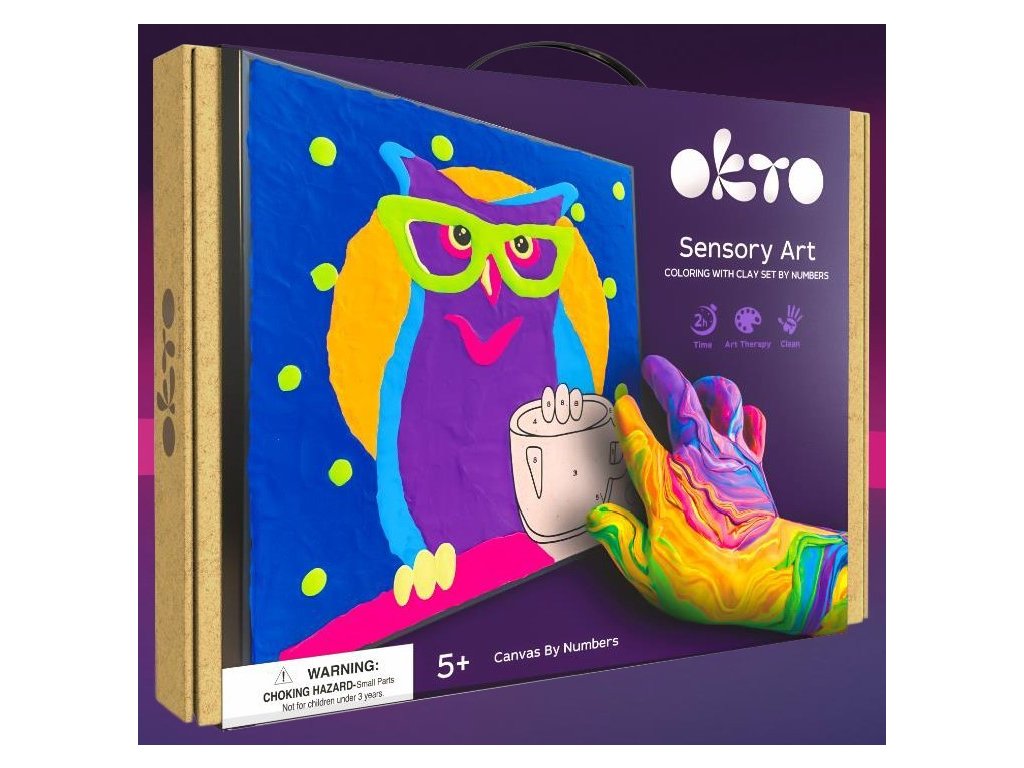 OKTO Sova výtvarná sada. Samotvrdnoucí hmota (air clay), malování prsty. Velikost plátna 29x29 cm. Obsah balení - plátno, obrázkový návod, tvarovací nástroje, samotvrdnoucí hmota.Doplňkové parametry