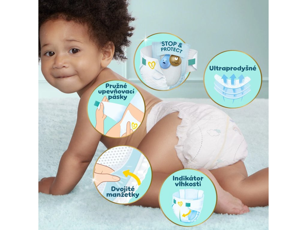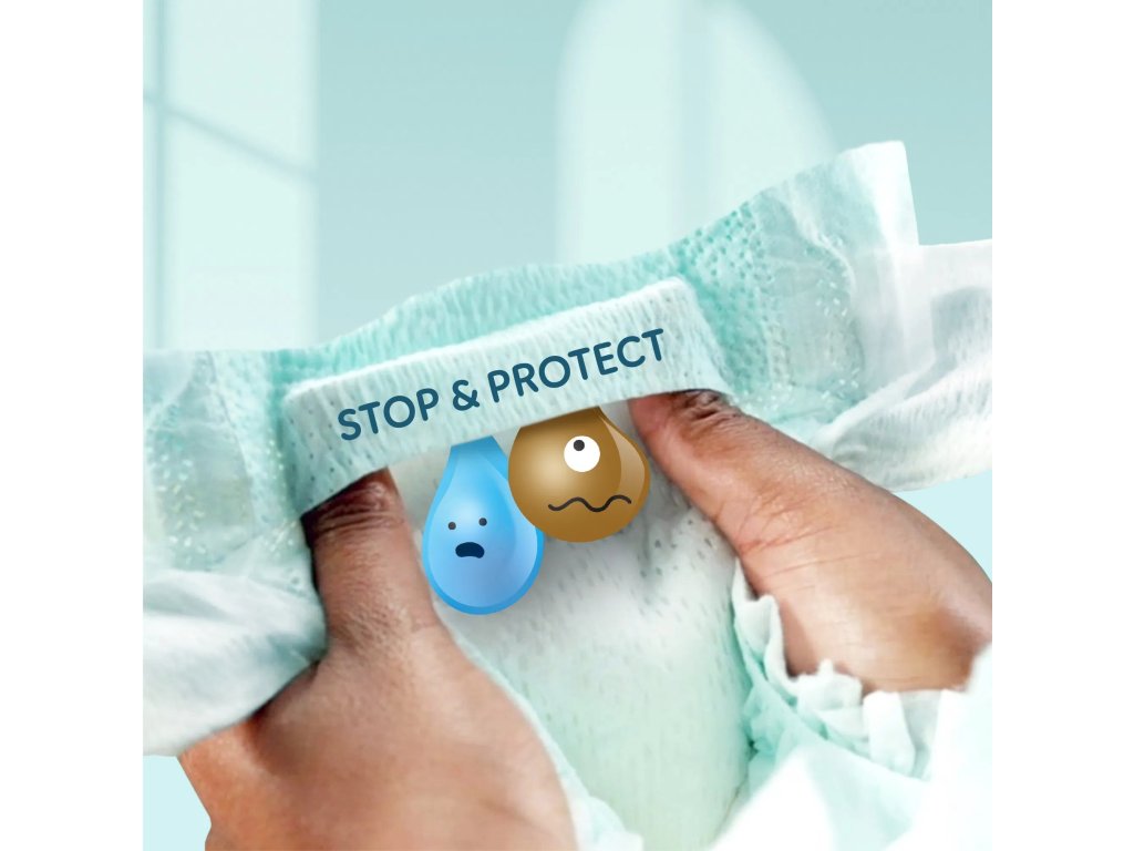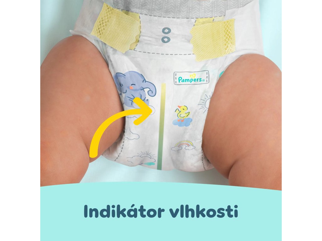 Plenky Pampers okamžitě absorbují tekutinu, čímž zajistí až 12 hodin v suchu.