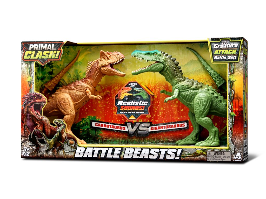 Primal Clash! Dino bitva set Carnotaurus VS Gigantosaurus. Výška figurek dinosaurů je 21 cm. Pohyblivá hlava a čelist, zvukové efekty - aktivace sklopením hlavy dinosaura. Balení obsahuje 2 dinosaury. Každý dinosaurus - 3xAG13 baterie, součástí balení (celkem 6xAG13).Doplňkové parametry