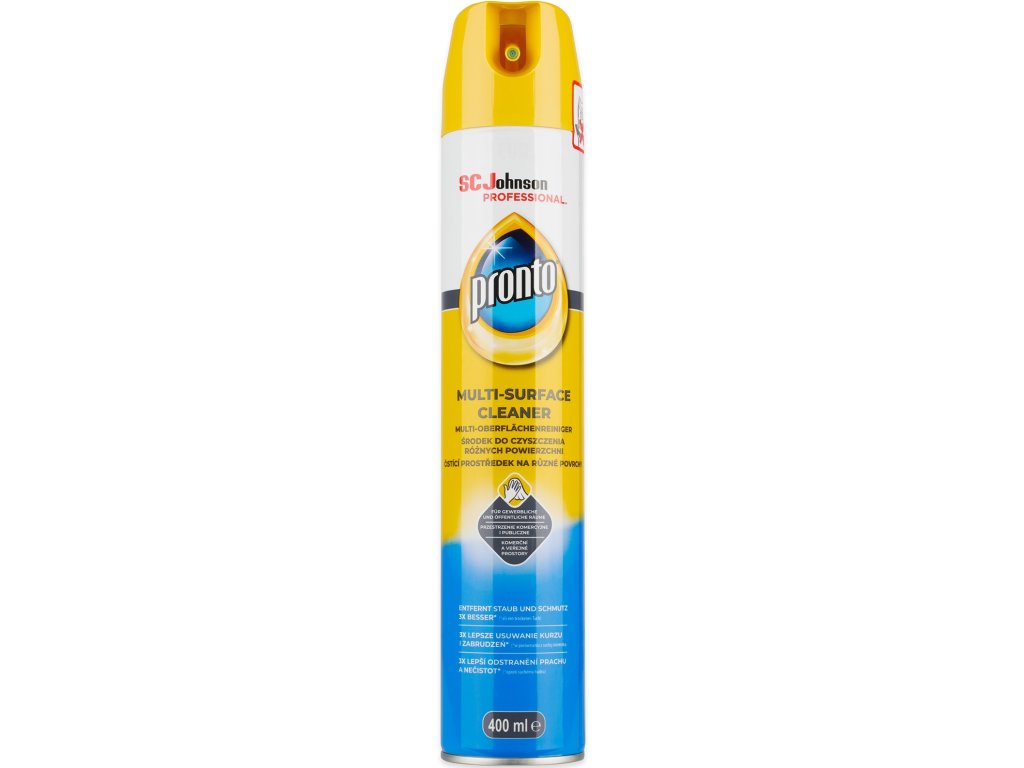 Multifunkční sprej Pronto proti prachu na různé povrchy. Universální antistatický čisticí prostředek a leštidlo na moderní povrchy a nábytek. Odstraňuje prach z různých povrchů jako je např. chrom, nerez, lakované a laminované dřevo, sklo, zrcadla, plasty, žula, křemen atd. Odstraňuje otisky prstů, šmouhy a lepkavé stopy. Nepoužívejte na plazmové a LCD obrazovky.