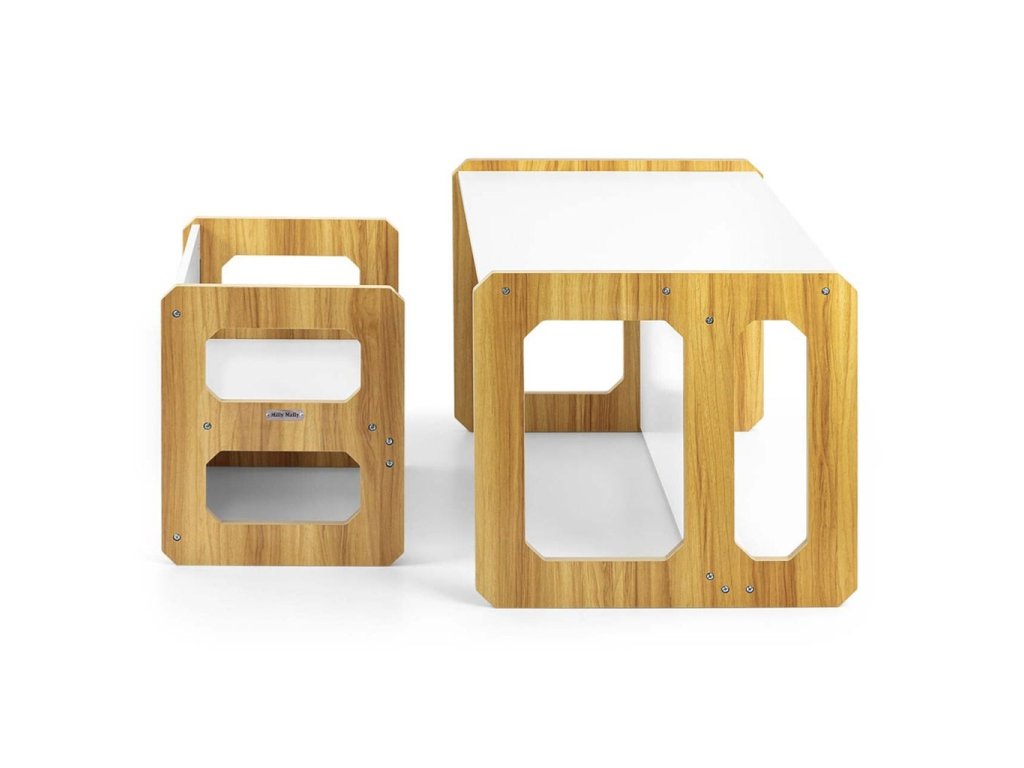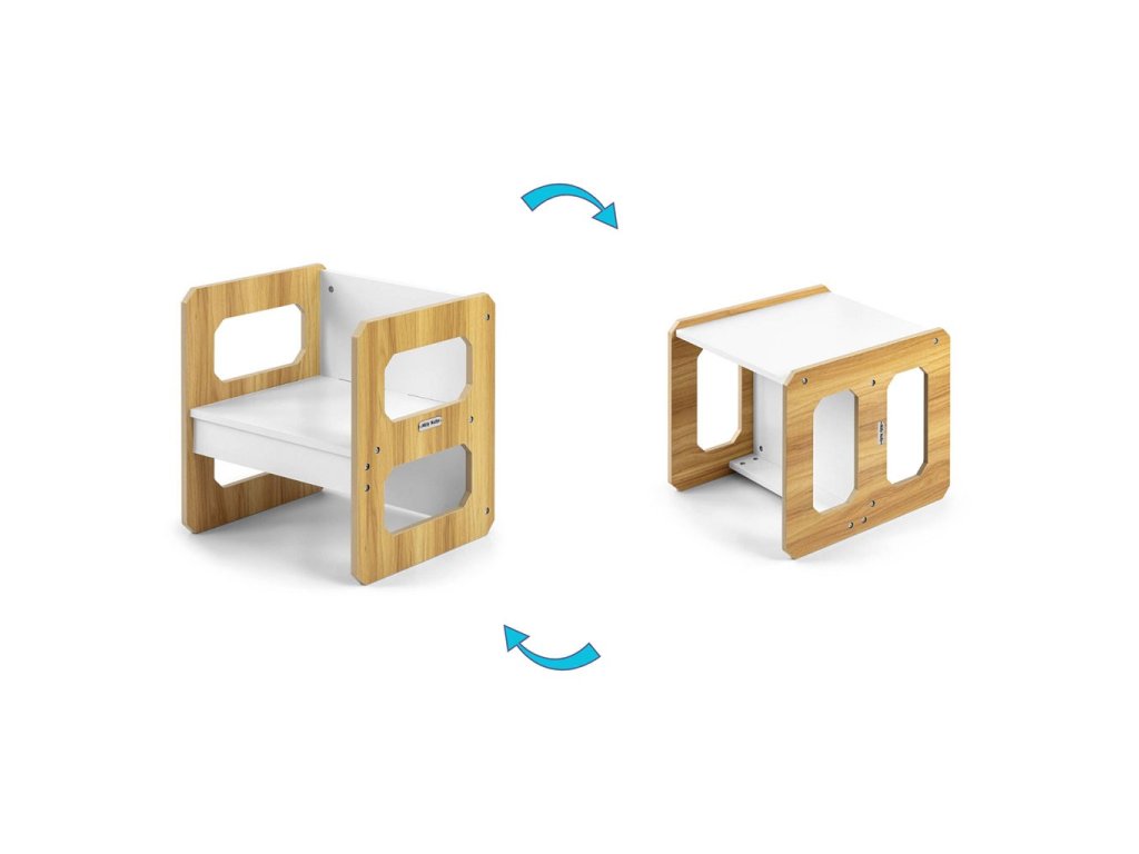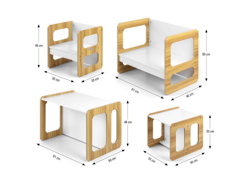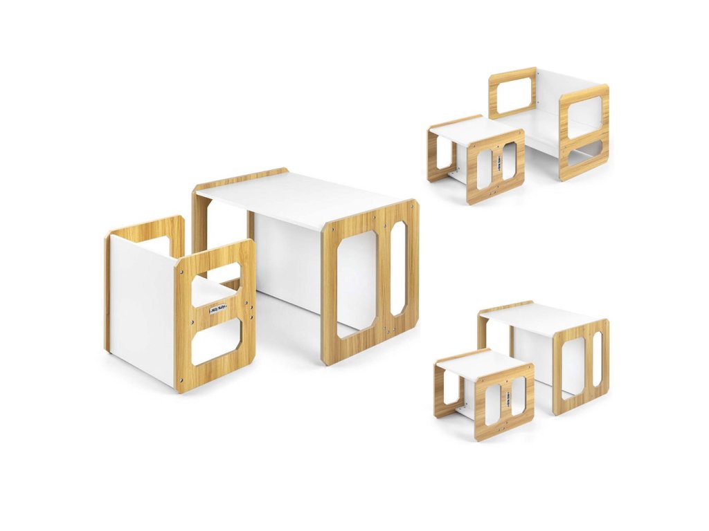 Sada se skládá z jednoho stolku a jedné židličky, které díky modulární konstrukci mohou plnit různé funkce – stolek lze proměnit ve větší sedadlo a židlička se dokonale hodí jako menší stolek nebo sedátko bez opěradla pro starší dítě. Díky své lehké konstrukci je tento nábytek snadno přenosný, což umožňuje dětem přizpůsobit si ho podle svých potřeb.