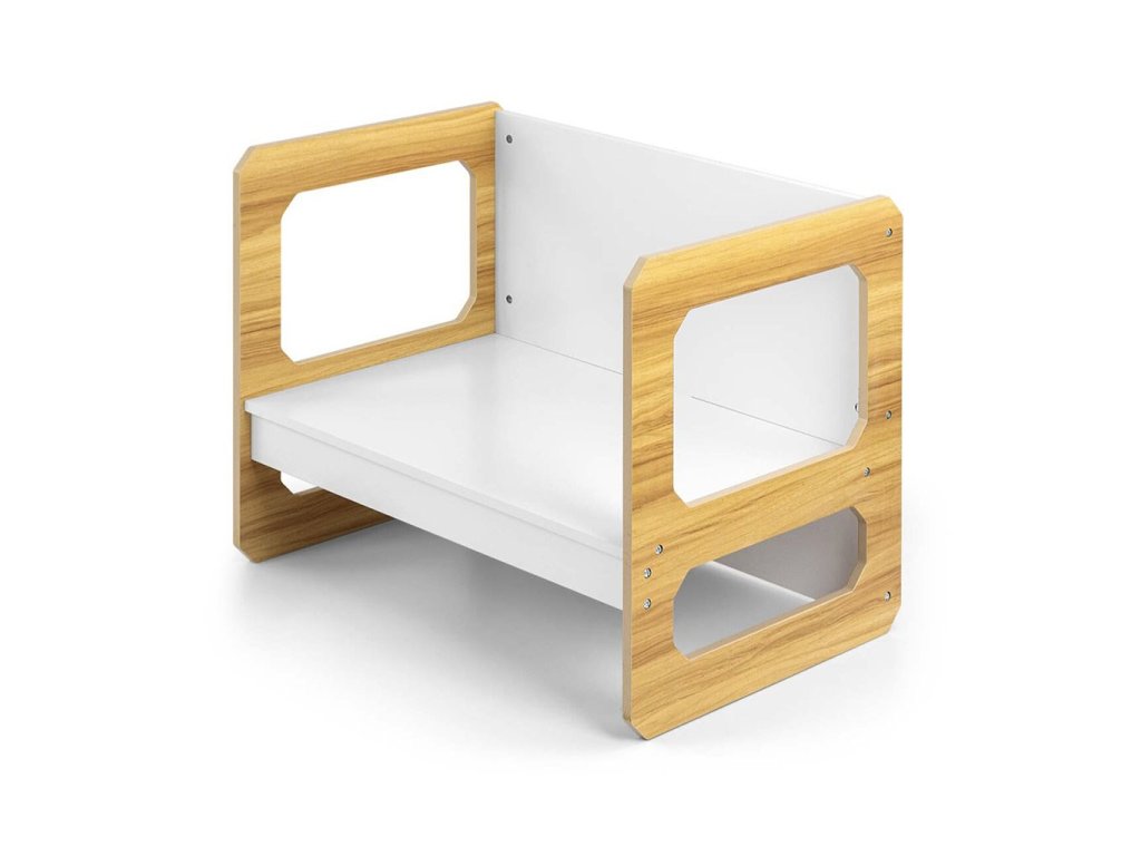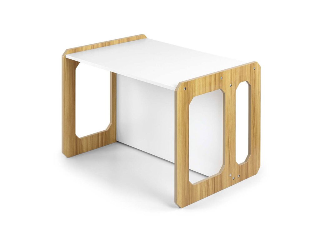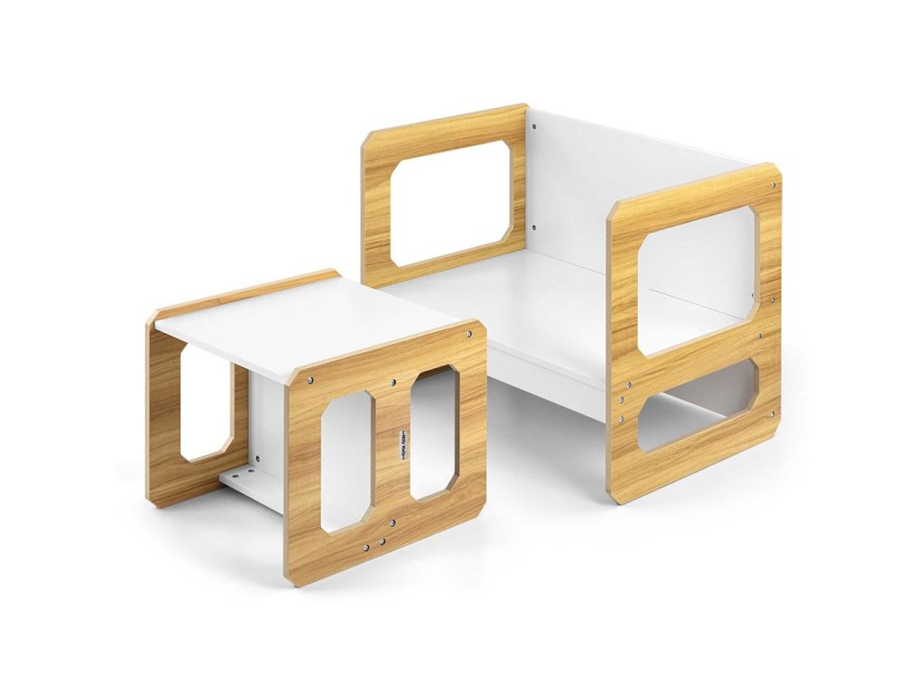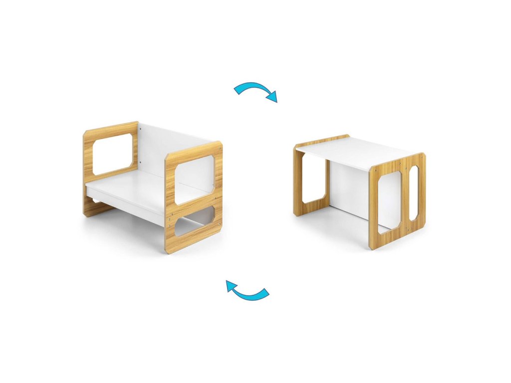 Sada se skládá z jednoho stolku a jedné židličky, které díky modulární konstrukci mohou plnit různé funkce – stolek lze proměnit ve větší sedadlo a židlička se dokonale hodí jako menší stolek nebo sedátko bez opěradla pro starší dítě. Díky své lehké konstrukci je tento nábytek snadno přenosný, což umožňuje dětem přizpůsobit si ho podle svých potřeb.