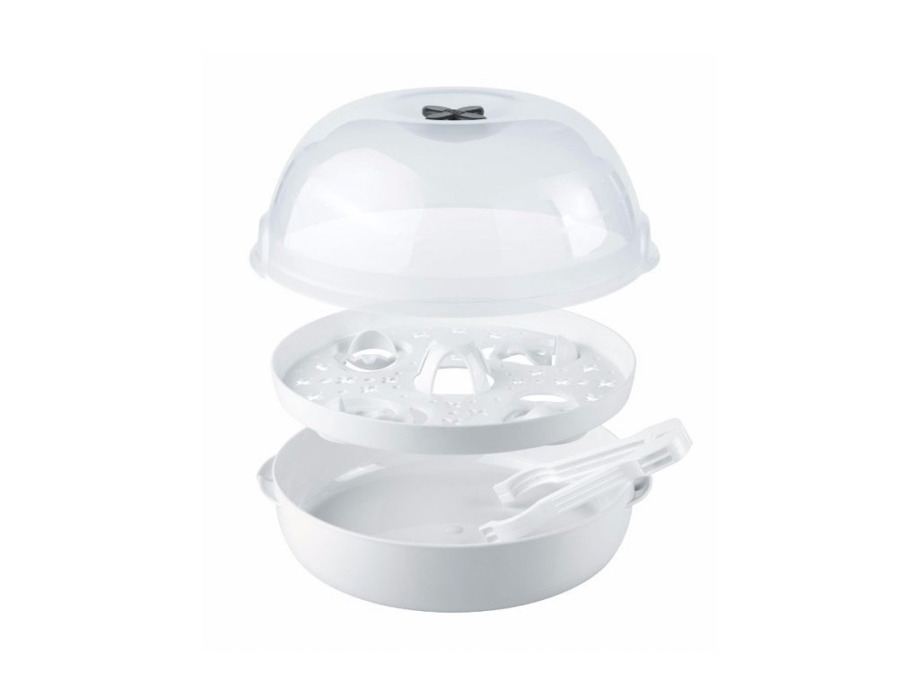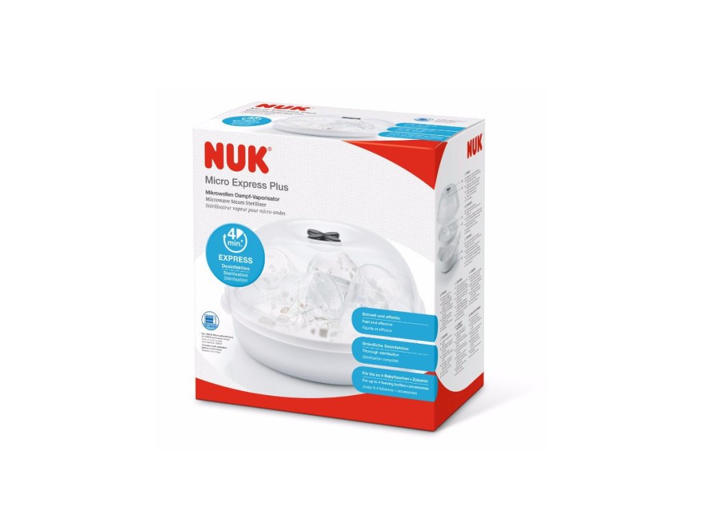 Sterilizátor do mikrovlnné trouby Vario Express Plus Nuk. Parní sterilizátor do mikrovlnné trouby Micro Express Plus NUK až pro čtyři lahve a příslušenství, rychlý, účinný a důkladný. Je ideální pro každodenní sterilizaci kojeneckých lahví (kromě PA láhví) a příslušenství, které jsou vhodné do mikrovlnné trouby. Sterilizuje až čtyři lahve a příslušenství za pouhé čtyři minuty (nastavení výkonu na 1 000 wattů) se snadnou obsluhou. Součástí balení jsou kleště na láhve pro hygienické vyjmutí. Pozor na minimální potřebnou velikost mikrovlnné trouby. Rozměry: výška cca 18-19 cm, šířka cca 30 cm, hloubka cca 29-30, obvod cca 83 cm.Doplňkové parametry