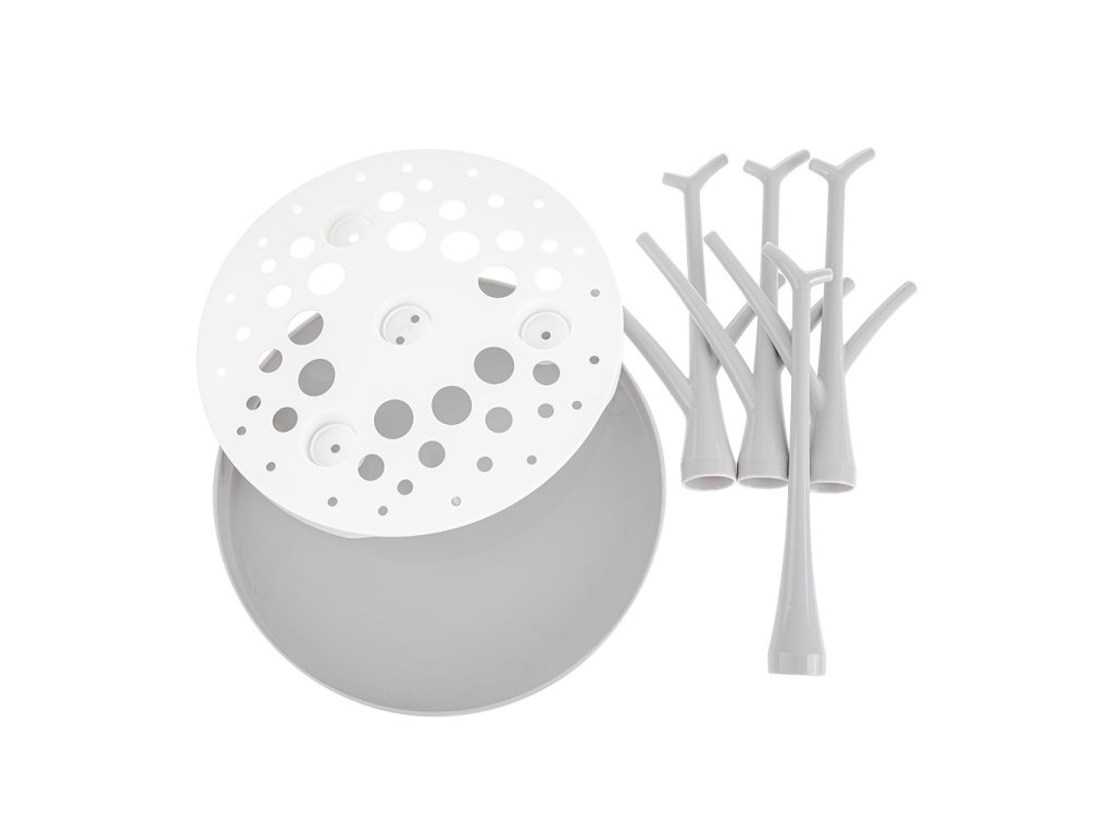 Sušička, odkapávač na láhve a příslušenství je ideálním pomocníkem na doma i na cestách. Speciální tvar spodní části byl navržen tak, aby odváděl vodu do jednoho místa a sušička nemusela být umístěna na dřezu. Je vhodná pro všechny typy lahví a dudlíků. Je snadno složitelná, čímž zabírá málo místa a lze jí mýt v myčce.