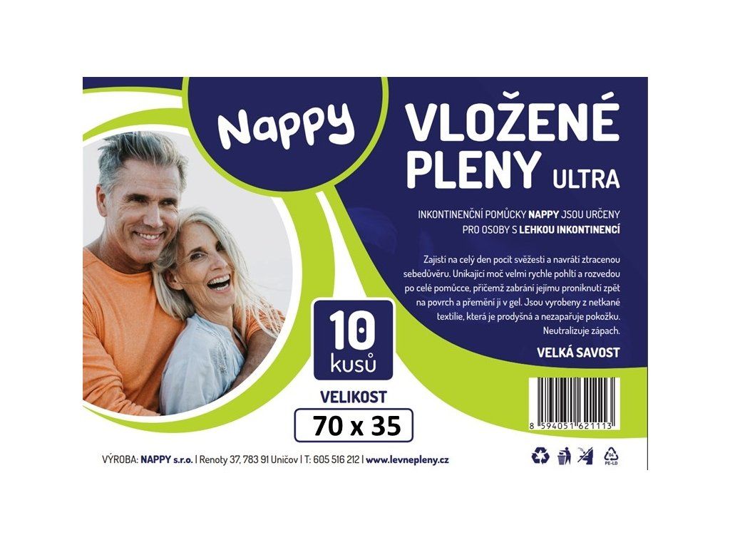 Pod naší značkou NAPPY najdete kvalitní přebalené vložné pleny určené převážně pro západní trh. Jedná se o vložné pleny s prodyšným antibakteriálním povrchem jemné jako bavlna bránící opruzeninám, vhodné pro citlivou pokožku. Jsou anatomicky tvarované zaručující pohodlné nošení a bezpečí. Mají vodoodpudivé pružné postranní manžetky, superabsorpční savé gelové jádro rychle pohlcující unikající moč a neutralizující nežádoucí zápach. Vhodné pro muže i ženy. V balení může být pokaždé výrobek jiného výrobce, ale vždy se jedná o typově stejný výrobek.