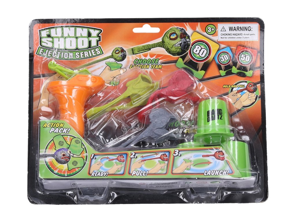Vystřelovací hra s terčem. Obsahuje prak, 3 šípy, 3 terče. 2 varianty - terč kelímky, terč karty s podstavci.