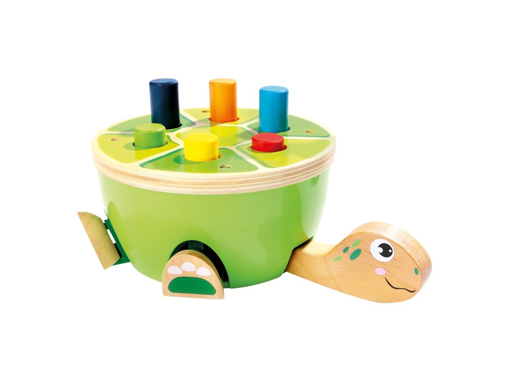 Barevná zatloukačka ve tvaru želvy pro malé děti. Zábavným způsobem rozvíjí dovednosti a soustředění našich nejmenších. Při zatloukání barevných kolíčků do dřevěného krunýře, vyskakují želvičce nohy a hlava. Hračka, která zaručeně probudí dětskou zvídavost a udrží pozornost na dlouhou dobu! Rozměr: 19x10,9x25,6 cm.Doplňkové parametry